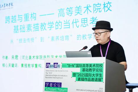未君的发言紧扣论坛核心议题,直指当前基础素描教学“应试化固化” 与 “美学价值弱化” 的双重矛盾,提出 “跨越单一流派依赖、跨越纯粹技术训练” 的 “双重跨越” 破局路径,及 “心态、素养、语言” 三维转向实施策略。其观点拓展了此次研讨的维度同时与各高等院校代表的分享形成学术呼应;既契合论坛“智能技术重塑教学体系” 的研讨方向,,也使河北美术学院在基础教学领域的探索进入国际视野并获得同行广泛关注。